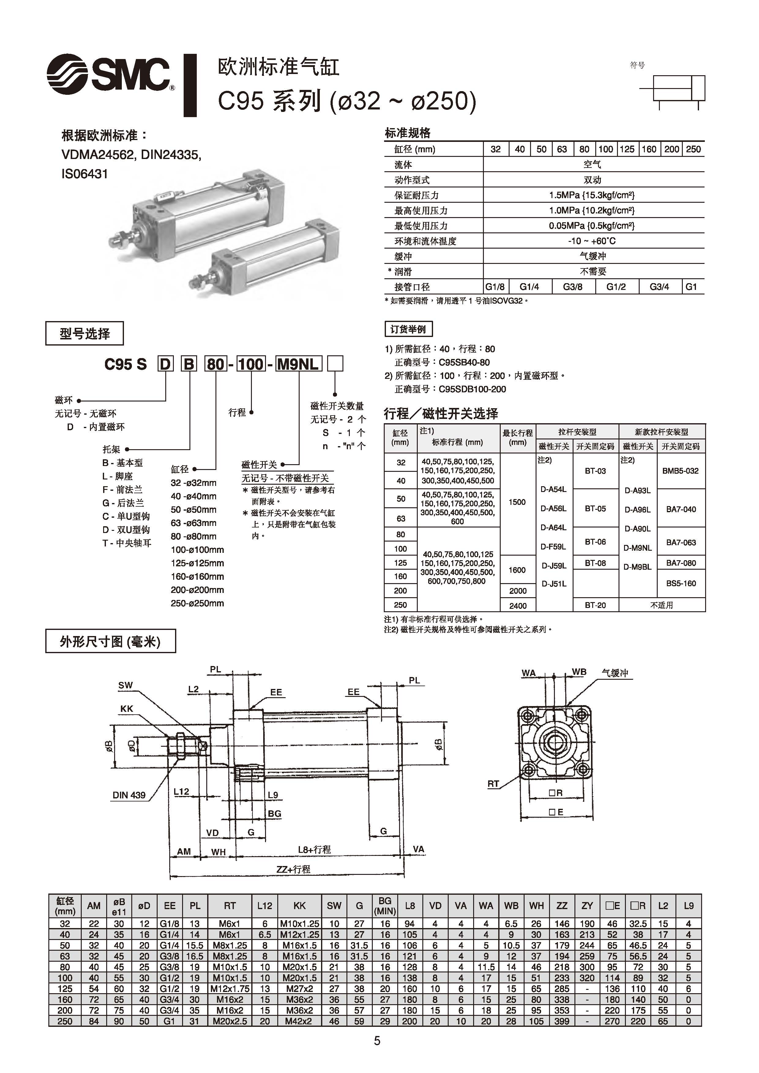 SMC欧洲标准气缸C95SDB32、C95SDB40、C95SDB50、C95SDB63、C95SDB80、C95SDB100、C95SDB125、C95SDB160、C95SDB200、C95SDB250外形尺寸样本参数选型手册